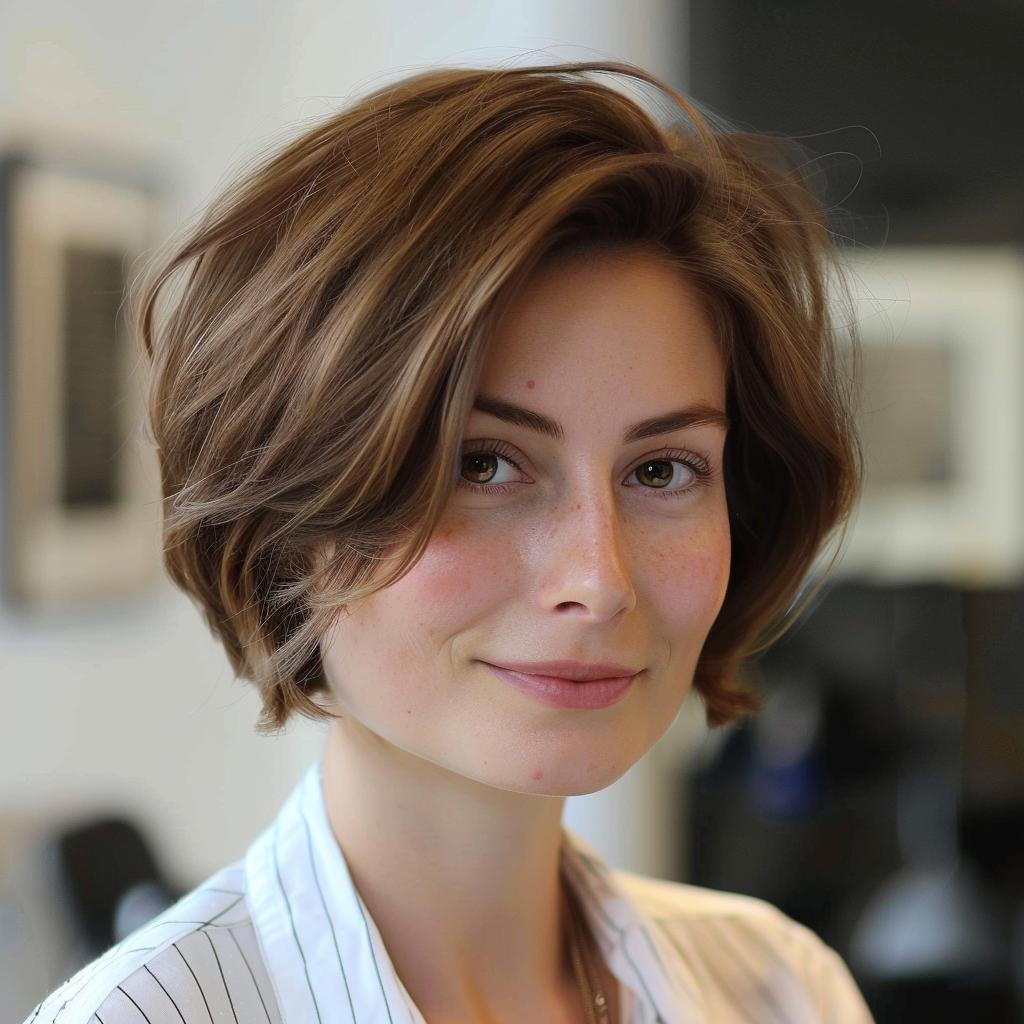 Die leicht zerzauste Textur dieses Bobs bringt Bewegung ins Haar und sorgt für einen modernen, unbeschwerten Look. Diese Frisur ist mühelos chic und passt super zu lebendigen Persönlichkeiten.
