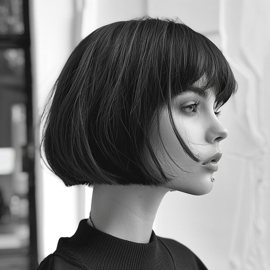 Ein zeitloser Klassiker! Der gerade geschnittene Pony fügt dem traditionellen Bob eine jugendliche und freche Note hinzu. Ideal für Frauen, die eine klare Linie und einen strukturierten Look bevorzugen.